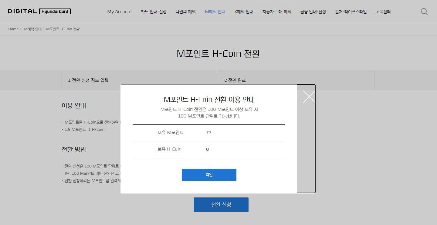우선 홈페이지에 들어가서 로그인을 하시고 M혜택안내 →M포인트 H-COIN 전환 을 눌러서 들어가시면 됩니다.