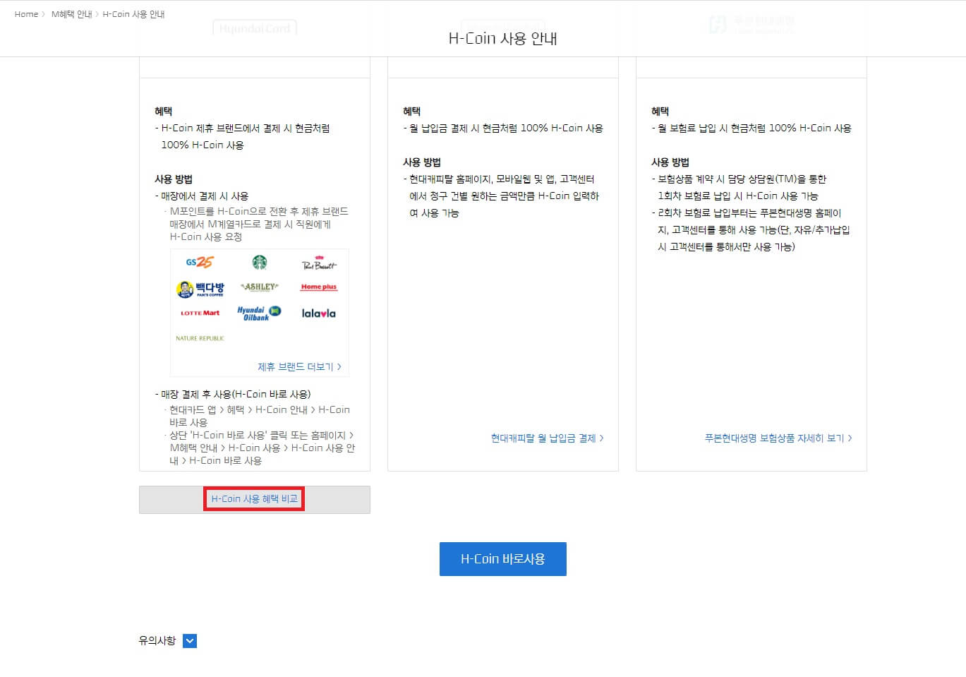 그 후 M혜택 안내 → H-Coin 사용 안내를 눌러서 들어가주시기 바랍니다.
