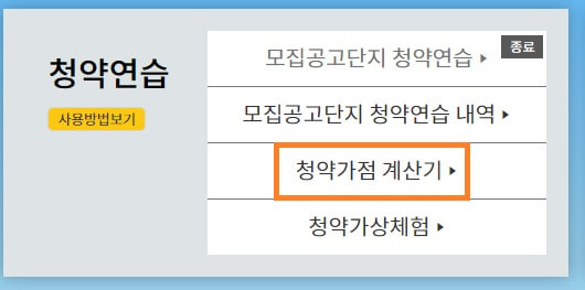 1. 청약홈 홈페이지의 오른쪽 하단을 보시면 청약연습이라도 탭이 있습니다. 여기에서 청약가점 계산기를 누르시기 바랍니다.