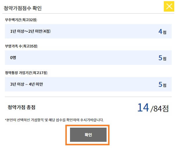 정보를 넣고 계산을 하시면 위와 같이 정보가 나옵니다. 본인의 정보에 맞춰서 입력하시고 계산하기를 누르시면 본인의 청약가점이 얼마인지 계산이 되어서 나옵니다. 청약가점이 높으면 추첨이 될 확률이 높아지기는 하지만, 꼭 높다고 다되는 것은 아니라고 합니다.